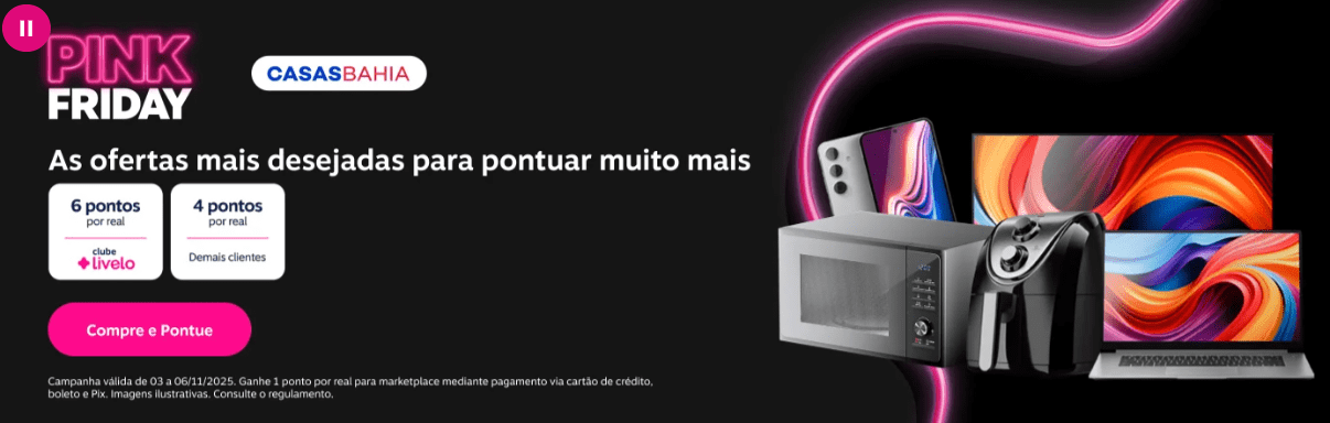 Casas Bahia: 6 pontos por real gasto exclusivo para assinantes Clube Livelo; 4 pontos por real para demais clientes em produtos vendidos e entregues por Casas Bahia e 1 ponto por real para marketplace mediante pagamento via cartão de crédito, boleto e Pix.