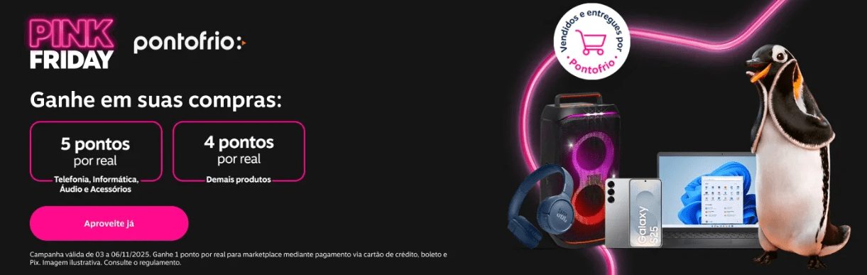 Ponto Frio: 5 pontos por real gasto nas categorias de telefonia, informática, áudio e acessórios; 4 pontos por real nos demais produtos vendidos e entregues por Pontofrio e 1 ponto por real para marketplace mediante pagamento via cartão de crédito, boleto e Pix.