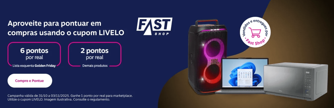 Fast Shop: 6 pontos por real gasto na lista esquenta Golden Friday; 2 pontos por real nos demais itens vendidos e entregues por Fast Shop e 1 ponto por real para marketplace.