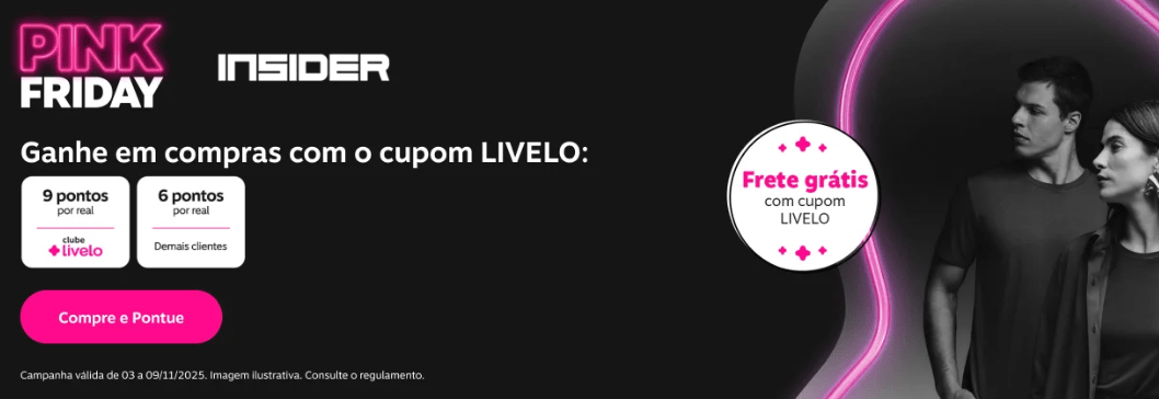 Insider: 9 pontos por real gasto exclusivo para assinantes Clube Livelo e 6 pontos por real para demais clientes + frete grátis.