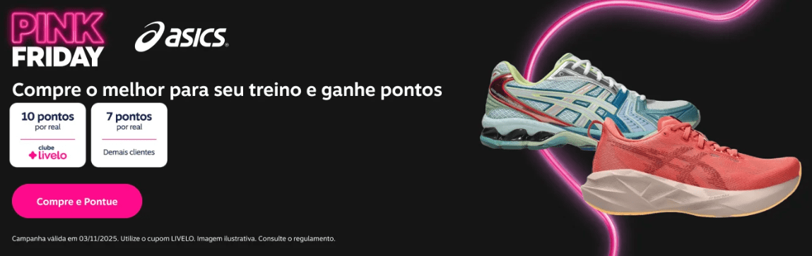 Asics: 10 pontos por real gasto exclusivo para assinantes Clube Livelo e 7 pontos por real para demais clientes.