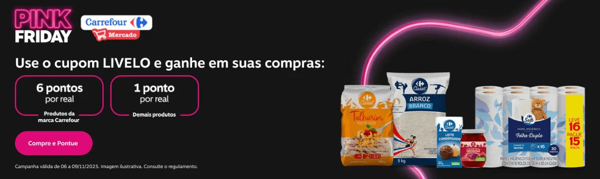 Carrefour Mercado: 6 pontos por real gasto em produtos Carrefour e 1 ponto por real nos demais itens.
