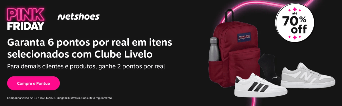 Netshoes: 6 pontos por real gasto em produtos selecionados exclusivo para assinantes Clube Livelo e 2 pontos por real para demais produtos e clientes.