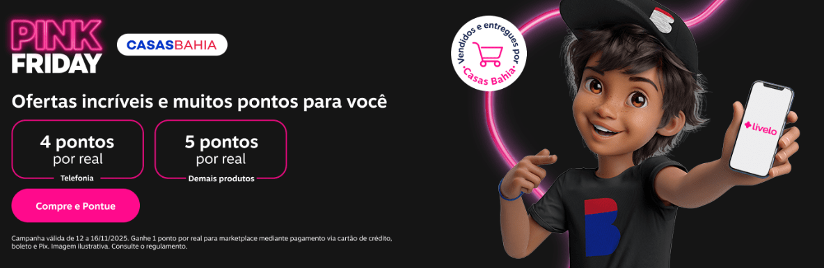 Casas Bahia: 4 pontos por real gasto na categoria de telefonia; 5 pontos por real nos demais produtos vendidos e entregues por Casas Bahia e 1 ponto por real para marketplace mediante pagamento via cartão de crédito, boleto e Pix.