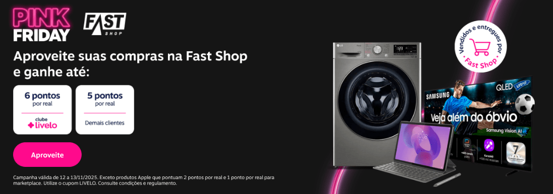 Fast Shop: 6 pontos por real gasto exclusivo para assinantes Clube Livelo; 5 pontos por real para demais clientes em produtos vendidos e entregues por Fast Shop, exceto produtos Apple que pontuam 2 pontos por real e 1 ponto por real para marketplace.
