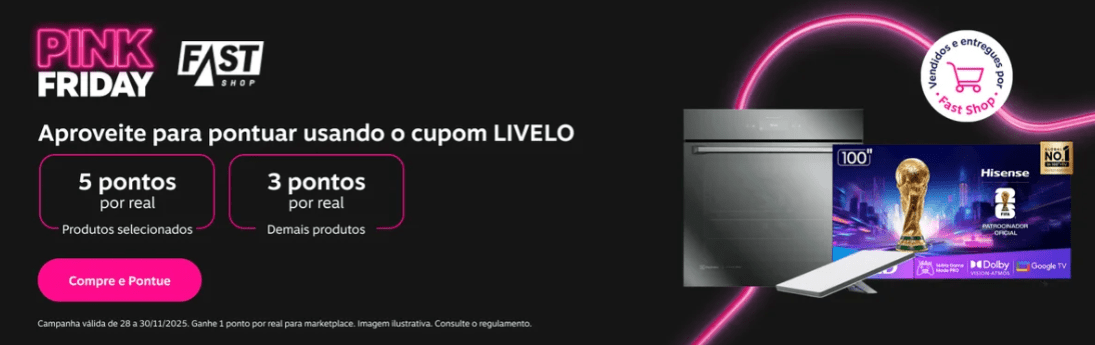 Fast Shop: 5 pontos por real gasto em produtos selecionados; 3 pontos por real nos demais produtos vendidos e entregues por Fast Shop e 1 ponto por real para marketplace.