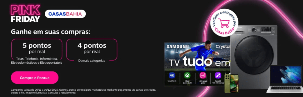 Casas Bahia: 5 pontos por real gasto nas categorias de Telas, Telefonia, Eletrodomésticos, Informática e Eletroportáteis; 4 pontos por real nos demais produtos vendidos e entregues por Casas Bahia e 1 ponto por real para marketplace mediante pagamento via cartão de crédito, boleto e Pix.