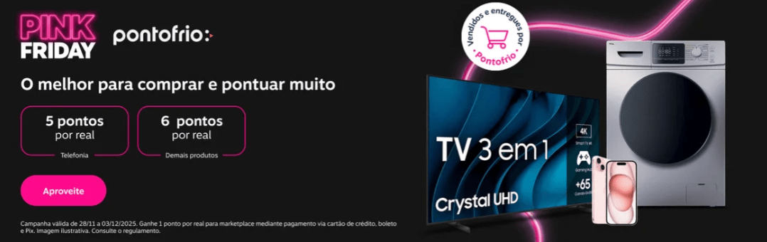 Ponto Frio: 5 pontos por real gasto na categoria de Telefonia; 6 pontos por real nos demais produtos vendidos e entregues por Pontofrio e 1 ponto por real para marketplace mediante pagamento via cartão de crédito, boleto e Pix.