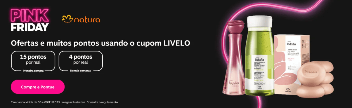 Natura: 15 pontos por real gasto na primeira compra na Natura e 4 pontos por real nas demais compras.