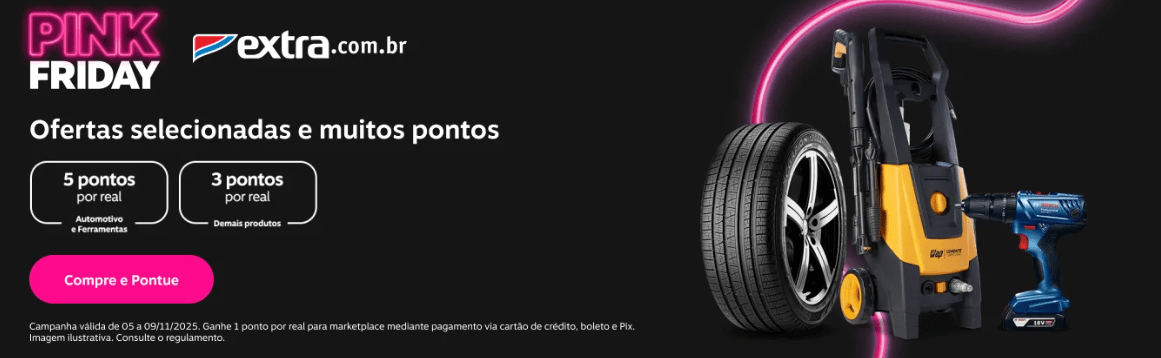 Extra: 5 pontos por real gasto nas categorias de automotivo e ferramentas; 3 pontos por real nos demais produtos vendidos e entregues por Extra e 1 ponto por real para marketplace mediante pagamento via cartão de crédito, boleto e Pix.