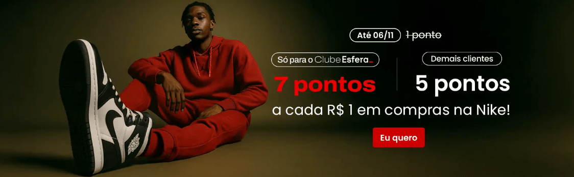 Nike: Clientes Clube Esfera: 7 pontos a cada R$ 1,00 em compras no site parceiro (5 pontos a cada R$ 1,00 para demais clientes).