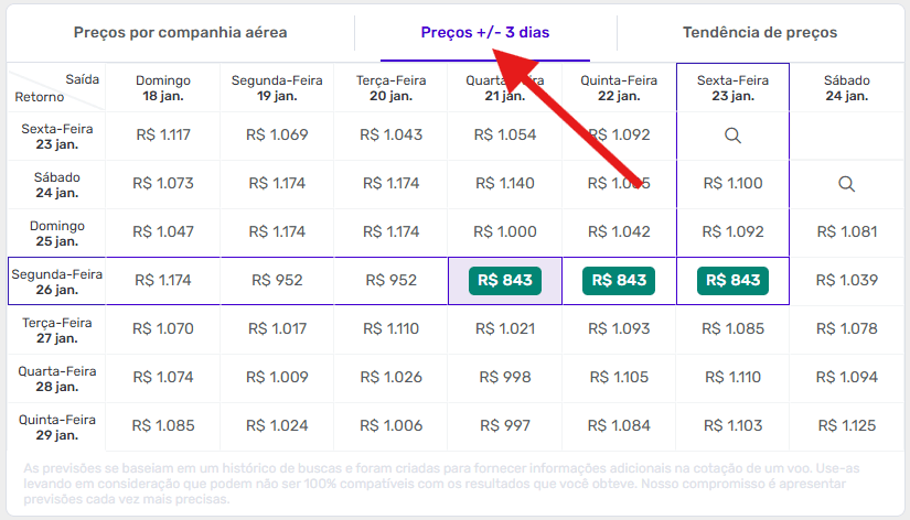 Após inserir origem e destinos, datas e clicar em buscar, acima dos resultados da busca, clique em “Preços +/- 3 dias” como mostra a imagem abaixo: