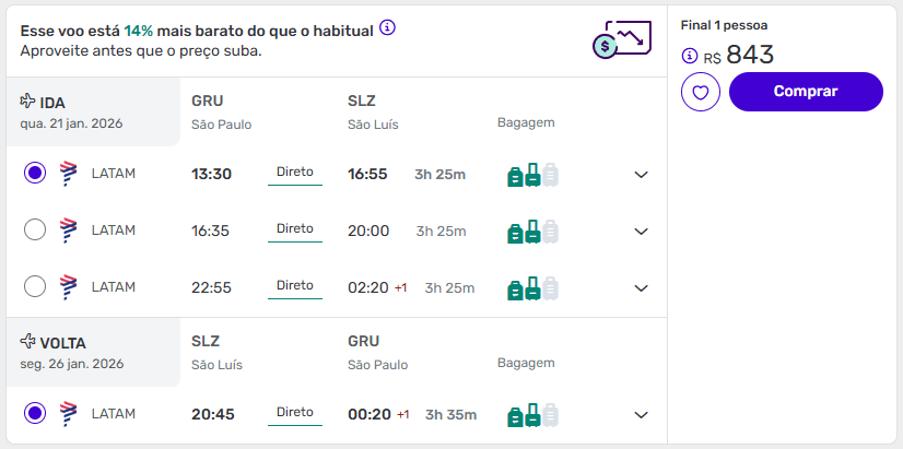 De São Paulo (GRU) para São Luís (SLZ) a partir de R$ 843 ida e volta na Decolar.
