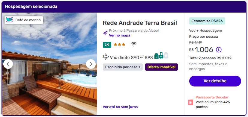 Este pacote de 4 noites inclui voos diretos de ida e volta saindo de São Paulo para Porto Seguro, na Bahia, e hospedagem no Rede Andrade Terra Brasil com café da manhã (nota 7.9) a partir de R$ 1.006 por pessoa, muito barato!