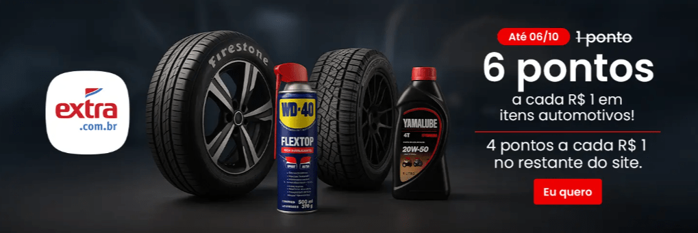 Extra: até 6 pontos a cada R$ 1,00 na categoria de automotivos e 4 pontos a cada R$ 1,00 no restante do site.