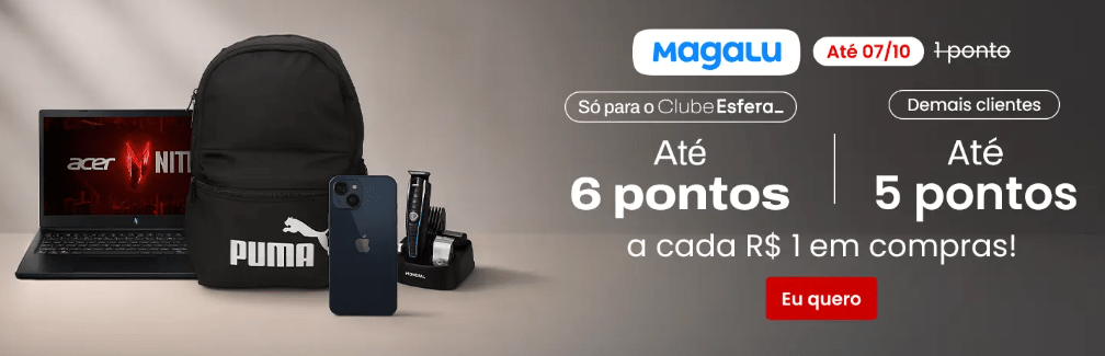 Magalu: até 6 pontos a cada R$ 1,00 em compras para clientes Clube Esfera e até 5 pontos a cada R$ 1,00 para demais clientes.