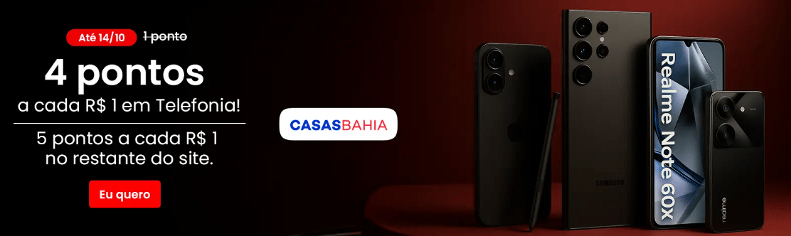 Casas Bahia: 4 pontos a cada R$ 1,00 na categoria de Telefonia e 5 pontos a cada R$ 1,00 no restante do site.