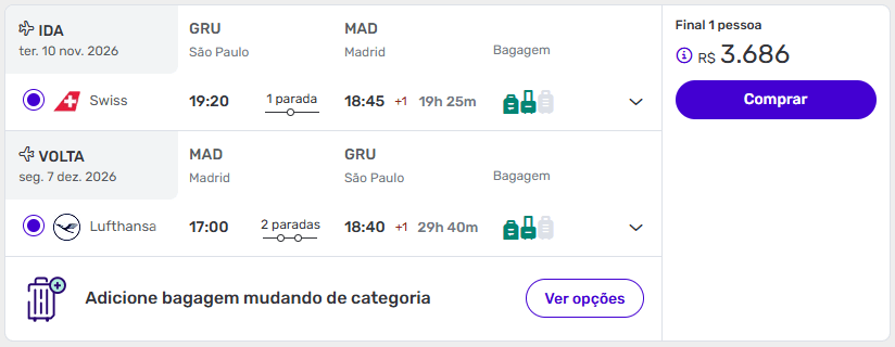 - Bagagem: possibilidade de adicionar nas tarifas superiores