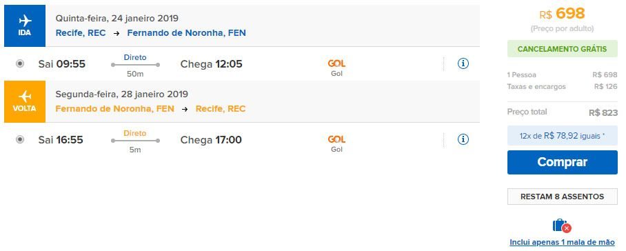 Na imagem, acima, podemos ver VoeGOL passagens aéreas em promoção saindo de Recife (REC) para Fernando de Noronha (FEN) por APENAS R$ 823 ida e volta, já com taxas inclusas, BARATO! E esse é só um exemplo.