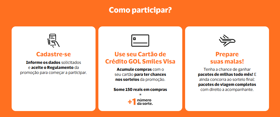 - Utilizar o Cartão de Crédito GOL Smiles Visa em compras válidas durante o período promocional;