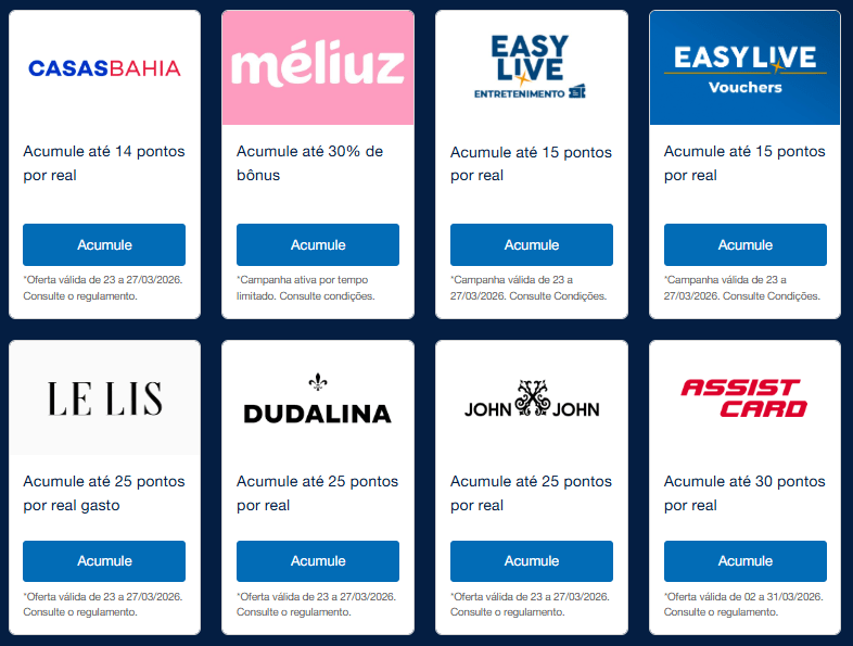 Entre os destaques, a parceria com a Casas Bahia permite acumular até 14 pontos por real gasto.