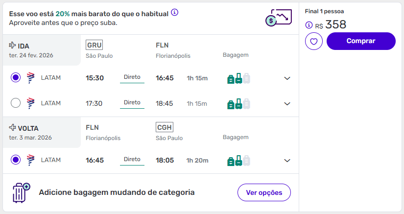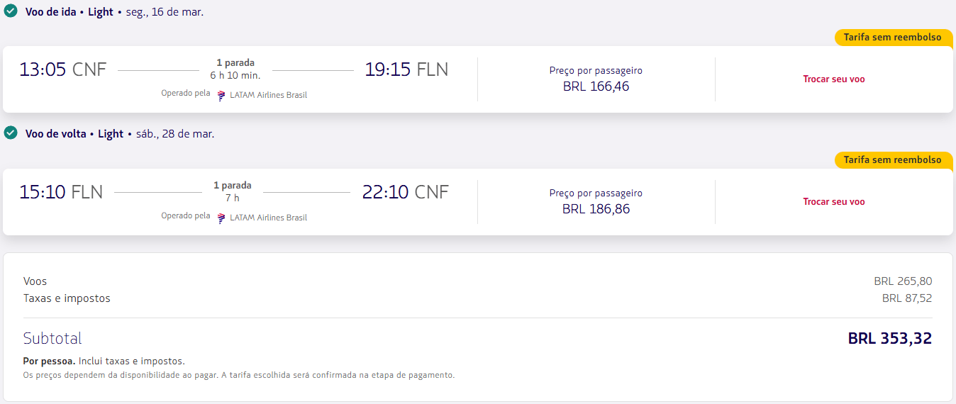 De Belo Horizonte (CNF) para Florianópolis (FLN) a partir de R$ 353,32 ida e volta com taxas inclusas na LATAM.