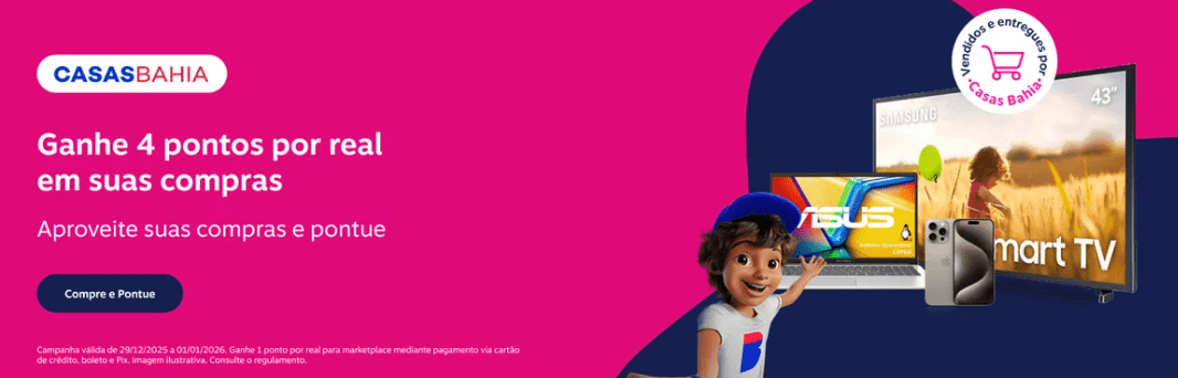 Casas Bahia: 4 pontos por real gasto em produtos vendidos e entregues por Casas Bahia e 1 ponto por real para marketplace mediante pagamento via cartão de crédito, boleto e Pix.