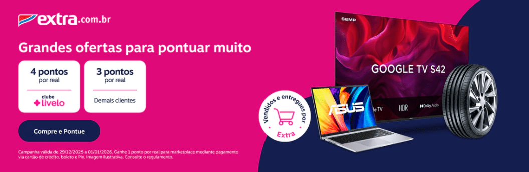 Extra: 4 pontos por real gasto exclusivo para assinantes Clube Livelo; 3 pontos por real para demais clientes em produtos vendidos e entregues por Extra e 1 ponto por real para marketplace mediante pagamento via cartão de crédito, boleto e Pix.