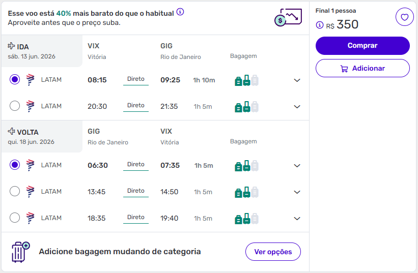 Vitória para o Rio de Janeiro — a partir de R$ 350