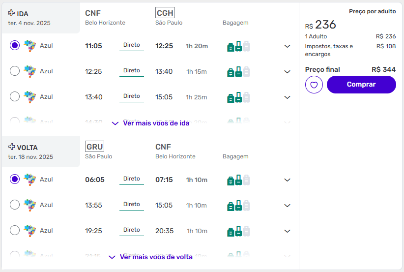 Na Decolar, de Belo Horizonte (CNF) para São Paulo (CGH) a partir de R$ 344 ida e volta.