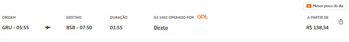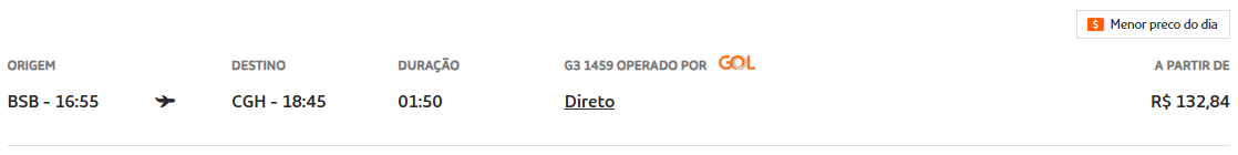 Na GOL, de Brasília (BSB) para São Paulo (CGH) a partir de R$ 132,84 o trecho de ida e R$ 138,34 a volta, totalizando R$ 271,18 ida e volta.