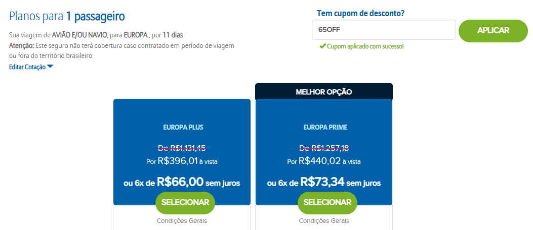 Mesmo existindo a referência ao código “65OFF”, o viajante não precisa aplicar nada manualmente. A própria plataforma da Allianz Travel reconhece a campanha e concede o abatimento automaticamente no momento da contratação.