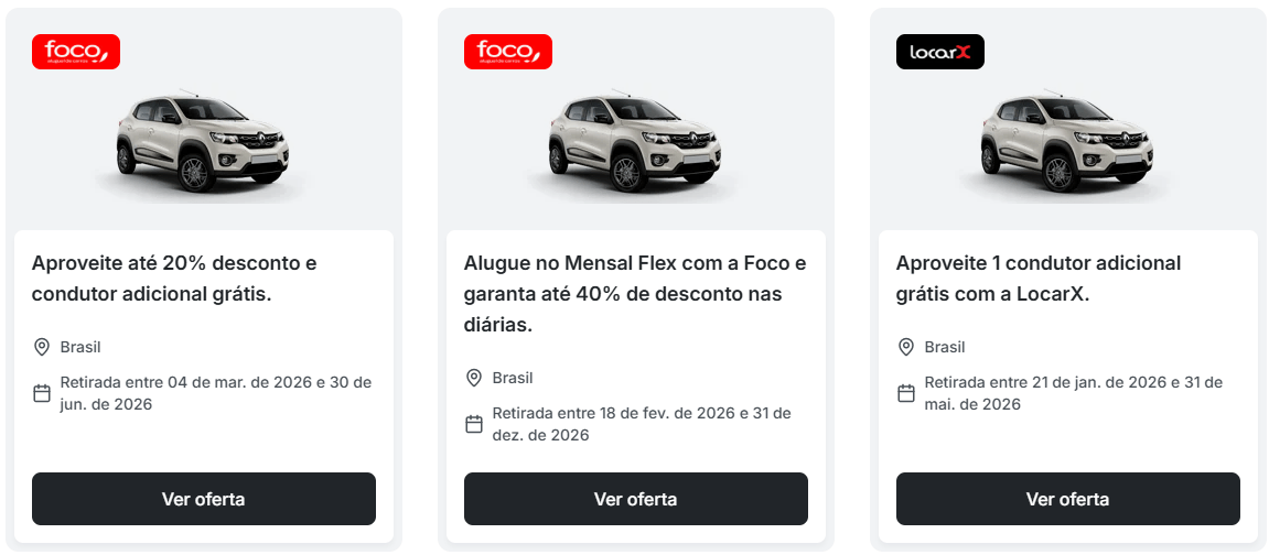 A página da promoção reúne diversas oportunidades com condições especiais em diferentes locadoras e categorias de veículos. Em muitos casos, além do desconto direto nas diárias, também há benefícios adicionais como condutor extra gratuito ou upgrade de categoria.