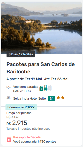 Outra ótima opção encontrada inclui hospedagem no Selva India Hotel Suite, com nota 9,1, também com 7 noites de hospedagem e voos entre São Paulo e San Carlos de Bariloche.