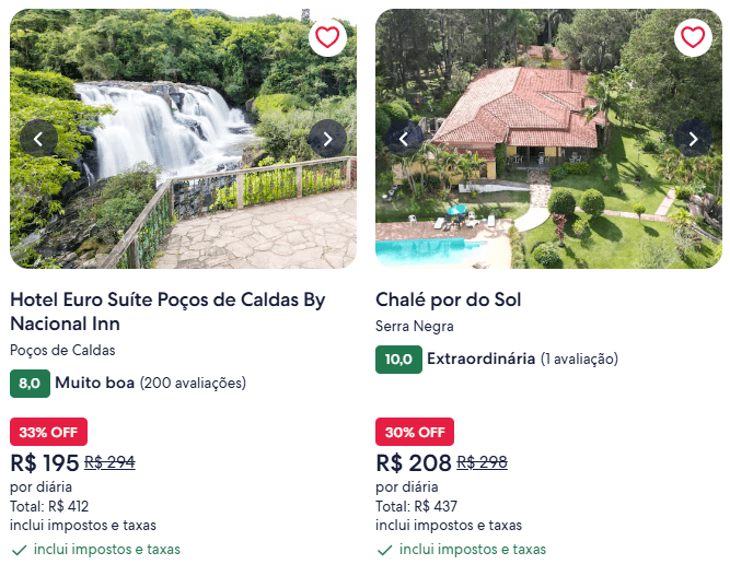 Durante a campanha, é possível encontrar hotéis, pousadas, resorts e chalés com preços reduzidos, tanto em destinos brasileiros quanto internacionais. Em algumas ofertas analisadas na plataforma, os descontos chegam a 59%, dependendo da propriedade e das datas escolhidas.