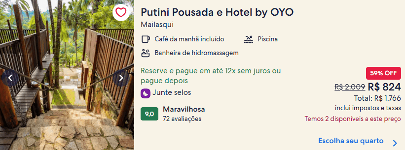 Durante a busca no site da Hoteis.com, encontramos diversas hospedagens nacionais com tarifas reduzidas. Veja alguns exemplos: