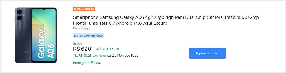 Samsung Galaxy A06 de R$ 999 por R$ 620 (37% de desconto!)