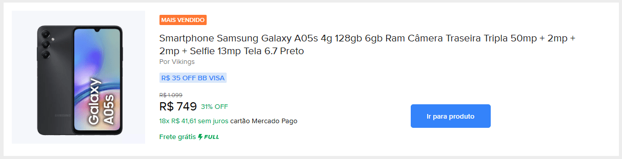 Samsung Galaxy A05s de R$ 1.099 por R$ 749 (31% de desconto!)