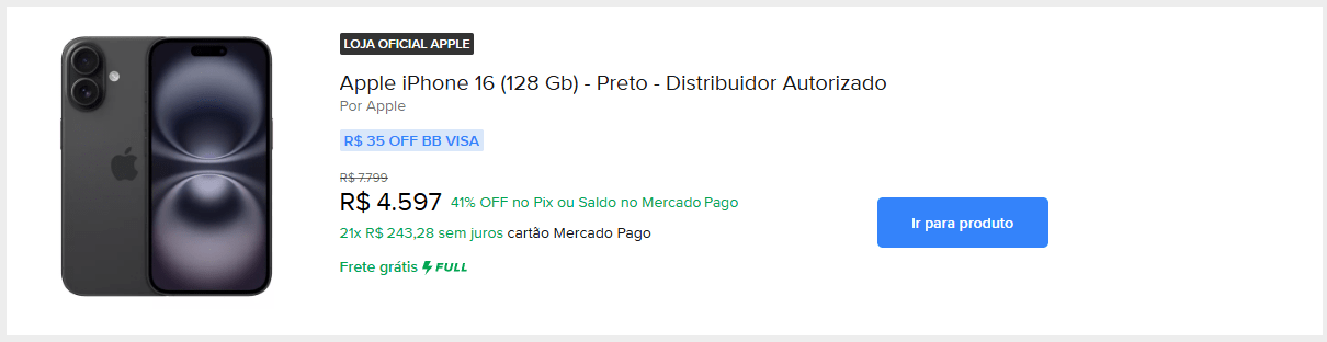 APPLE IPHONE 16 DE R$ 7.799 POR R$ 4.597 (41% DE DESCONTO!)