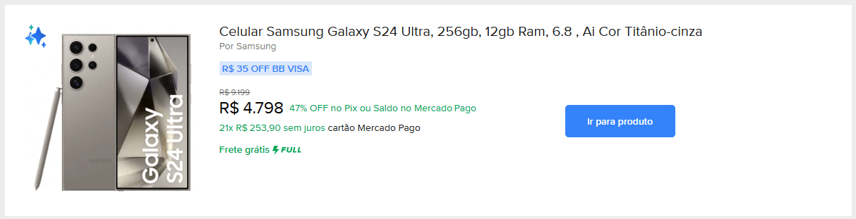 SAMSUNG GALAXY S24 ULTRA DE R$ 9.199 POR R$ 4.798 (47% DE DESCONTO!)