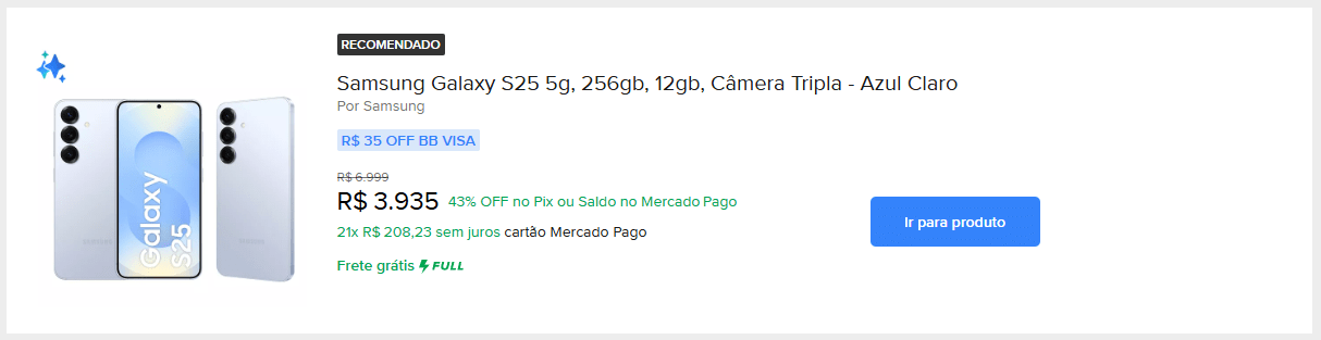 SAMSUNG GALAXY S25 DE R$ 6.999 POR R$ 3.935 (43% DE DESCONTO!)