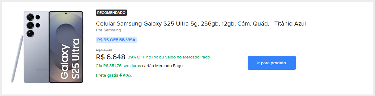 SAMSUNG GALAXY S25 ULTRA DE R$ 10.999 POR R$ 6.648 (39% DE DESCONTO!)