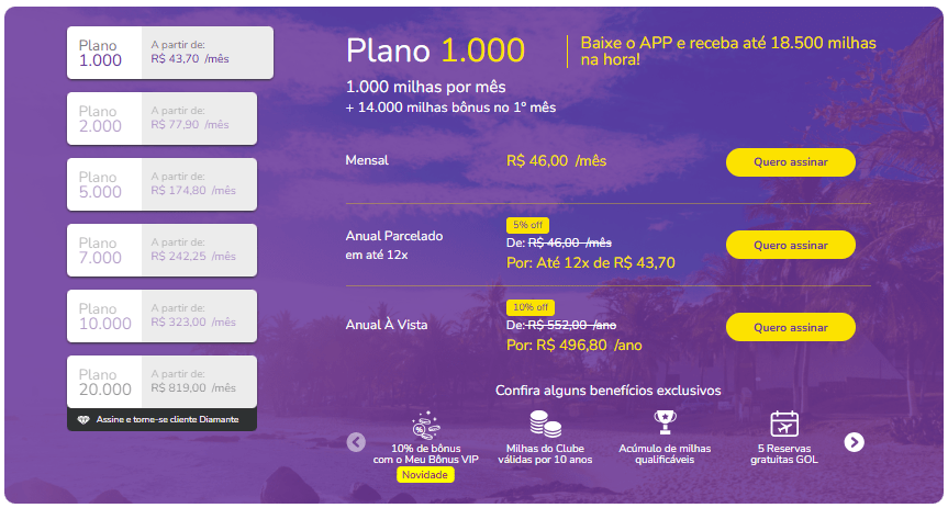 No plano 1.000, o assinante recebe 14.000 milhas de bônus no primeiro mês, podendo chegar a 18.500 milhas na adesão via aplicativo. Nesse plano, as milhas do Clube têm validade de 10 anos.