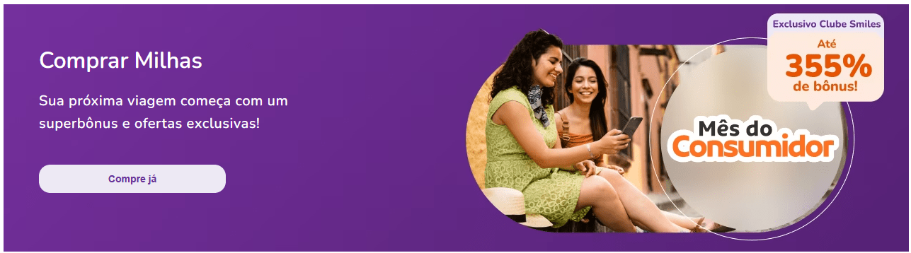 O programa de fidelidade Smiles iniciou uma nova promoção de compra de milhas com bônus elevado neste Mês do Consumidor. A campanha permite receber até 355% de milhas bônus para quem possui assinatura ativa no Clube Smiles ou status Diamante.