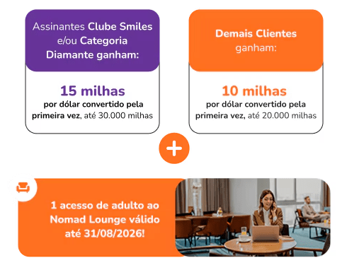 - 15 milhas Smiles por dólar convertido, limitado a 30.000 milhas, para clientes do Clube Smiles ou categoria Diamante