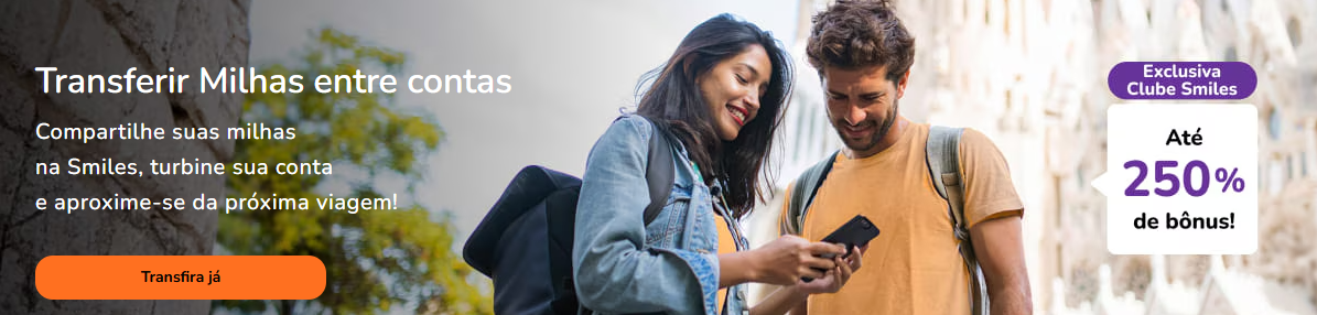 A Smiles lançou uma nova campanha voltada a clientes do Clube Smiles que desejam reforçar o saldo de milhas. Até as 10h do dia 5 de janeiro de 2026, quem transferir milhas para outra conta do programa pode receber até 250% de bônus, conforme o plano de assinatura ou categoria no programa.