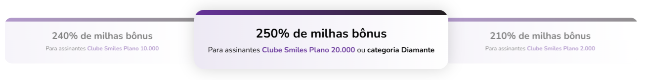 O percentual de bônus varia de acordo com o plano do Clube Smiles ou status do cliente. Confira os percentuais praticados durante a promoção: