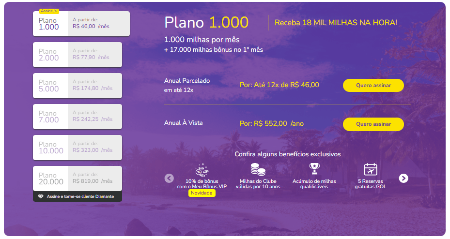 Os planos disponíveis vão de 1.000 a 20.000 milhas mensais, com valores a partir de R$ 46 por mês, e incluem benefícios como maior validade das milhas, bônus adicionais em transações e vantagens em resgates.
