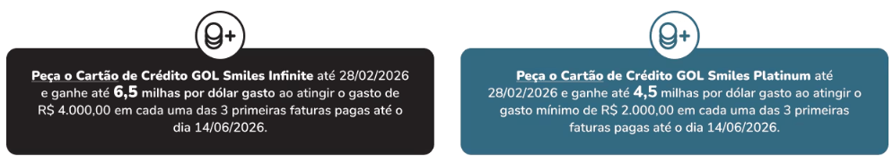 A Smiles está com uma nova oferta voltada para quem quer acelerar o acúmulo de milhas e já sair na frente no planejamento da próxima viagem. Quem solicitar o Cartão de Crédito GOL Smiles Infinite ou Platinum dentro até o dia 28/02 pode juntar até 6,5 milhas por dólar gasto, além de receber milhas extras na aquisição do cartão, dependendo da categoria.