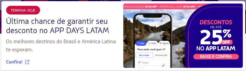 A promoção termina amanhã (31/10), às 23h59. Confira todas as ofertas diretamente no app, mais informações no site da LATAM.